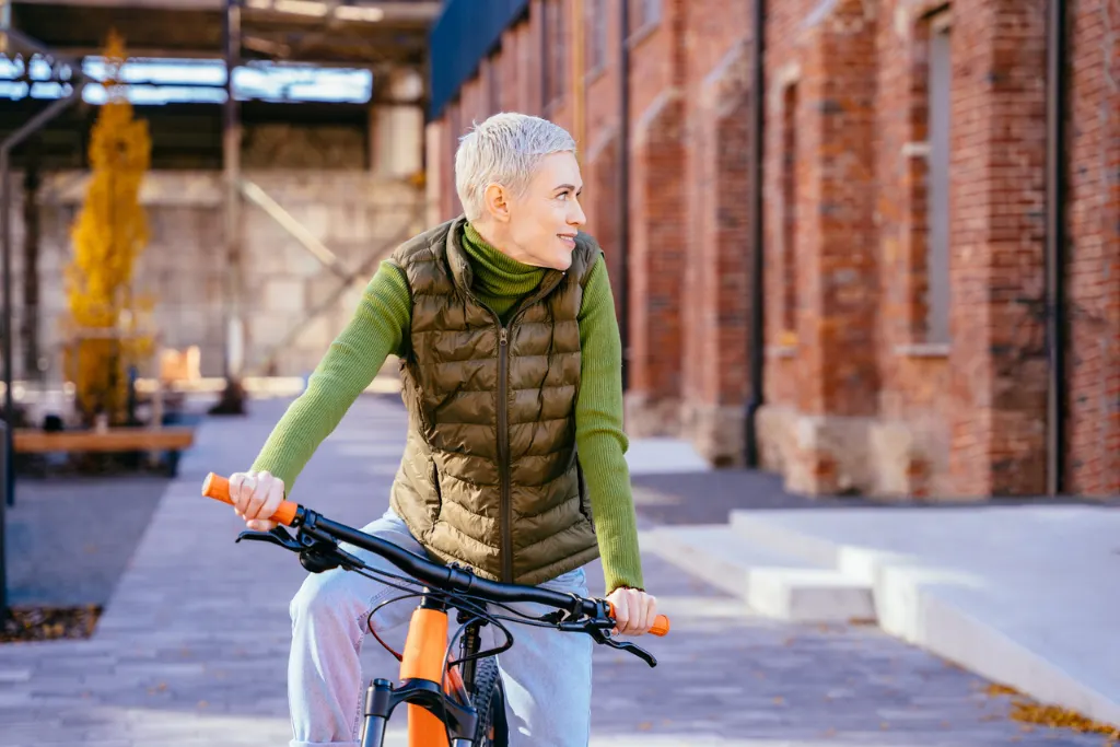 Dojrzała kobieta z krótkoobciętymi włosami na przejażdżce rowerowej
