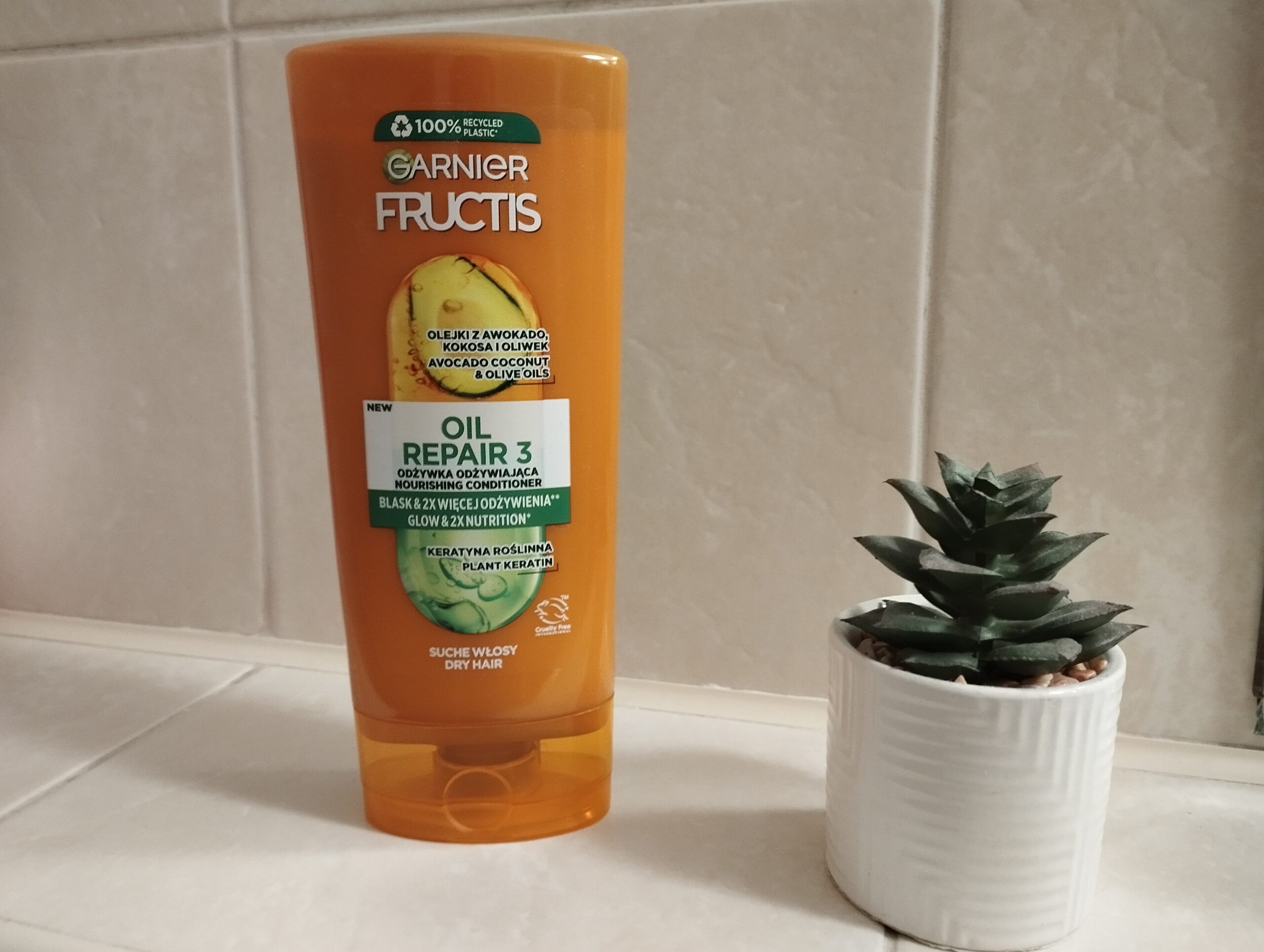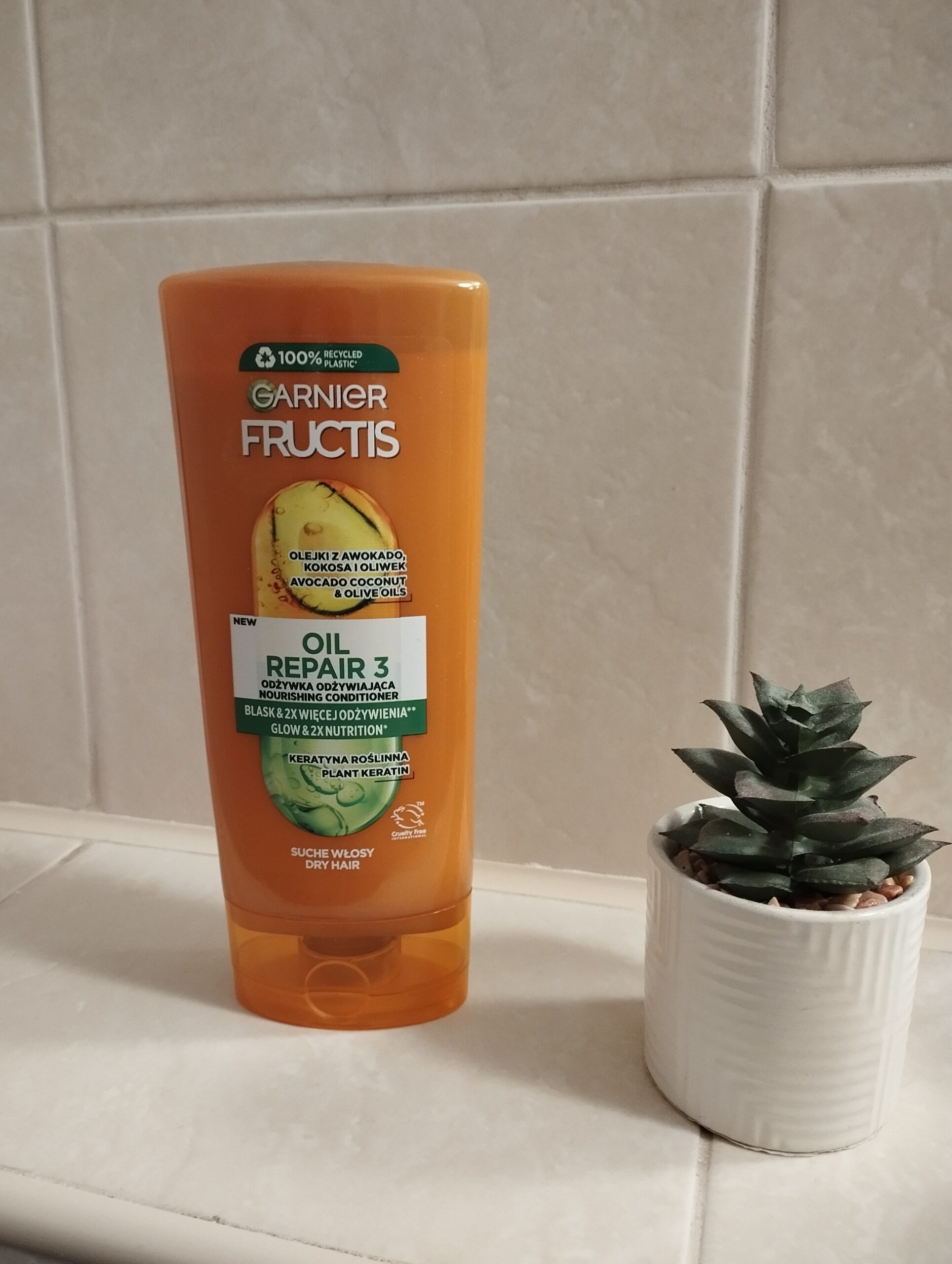 Odżywka zamknięta jest w charakterystycznej pomarańczowej butelce o pojemności 200 ml, która została wykonana w 100% z plastiku z recyklingu (poza korkiem i barwnikami). Cena produktu jest bardzo przystępna, co w połączeniu z jego skutecznością sprawia, że jest to jeden z najchętniej wybieranych kosmetyków do zniszczonych włosów.