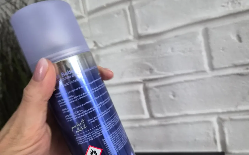 Opakowanie: Standardowa puszka aerozolowa z rozpylaczem – identyczna jak większość sprayów do włosów dostępnych w drogeriach. Nic wyróżniającego, ale też nic, co by przeszkadzało. Produkt mieści się wygodnie w ręce i – w przeciwieństwie do szklanego opakowania kremów – bez problemu możesz go zabrać ze sobą w podróż.